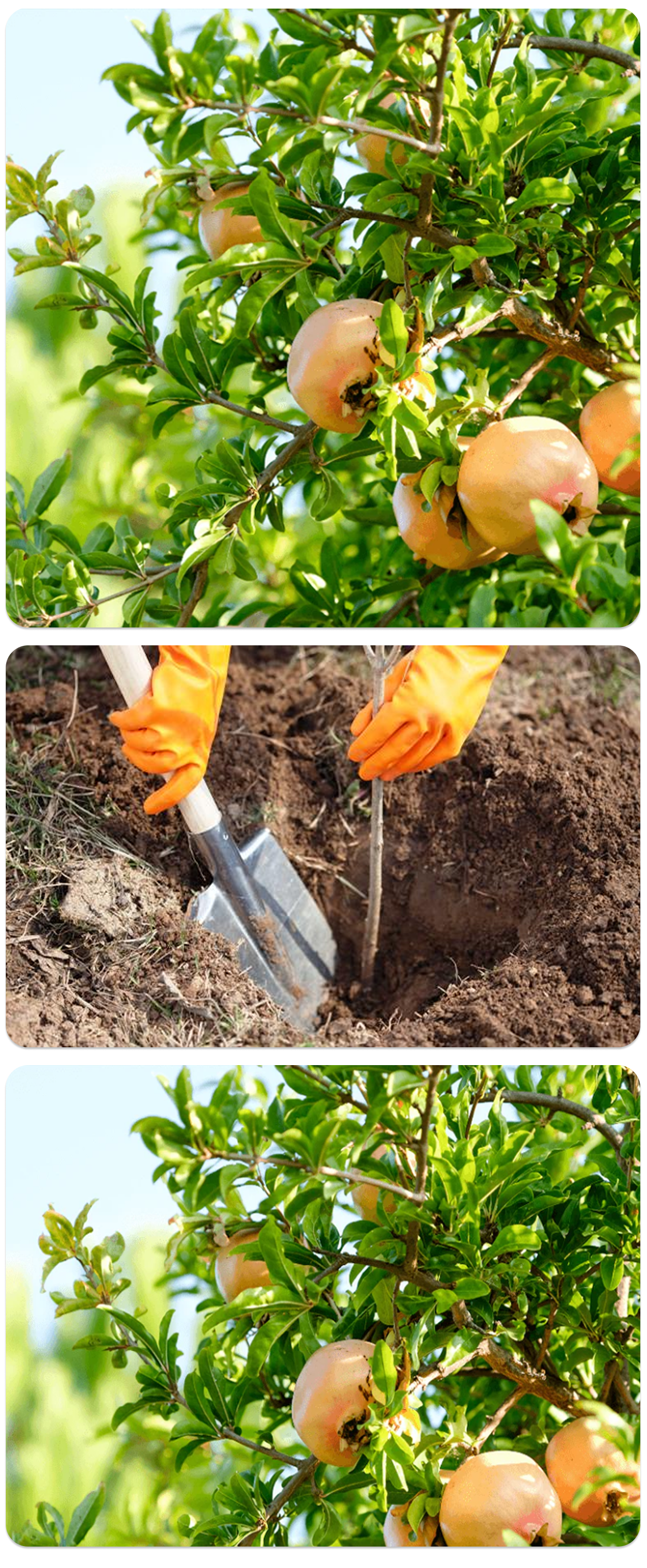Гранат любит солнце и лёгкую почву — и больше ему почти ничего не нужно! Выберите солнечное место, сделайте небольшую лунку и посадите саженец. Он быстро приживётся и не потребует сложных удобрений или обработки.